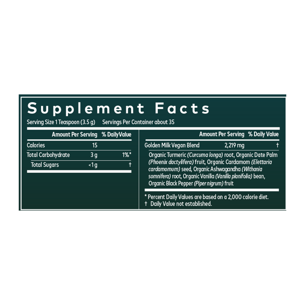 • Made with organic Turmeric, Ashwagandha, Dates, Cardamom, and Vanilla.