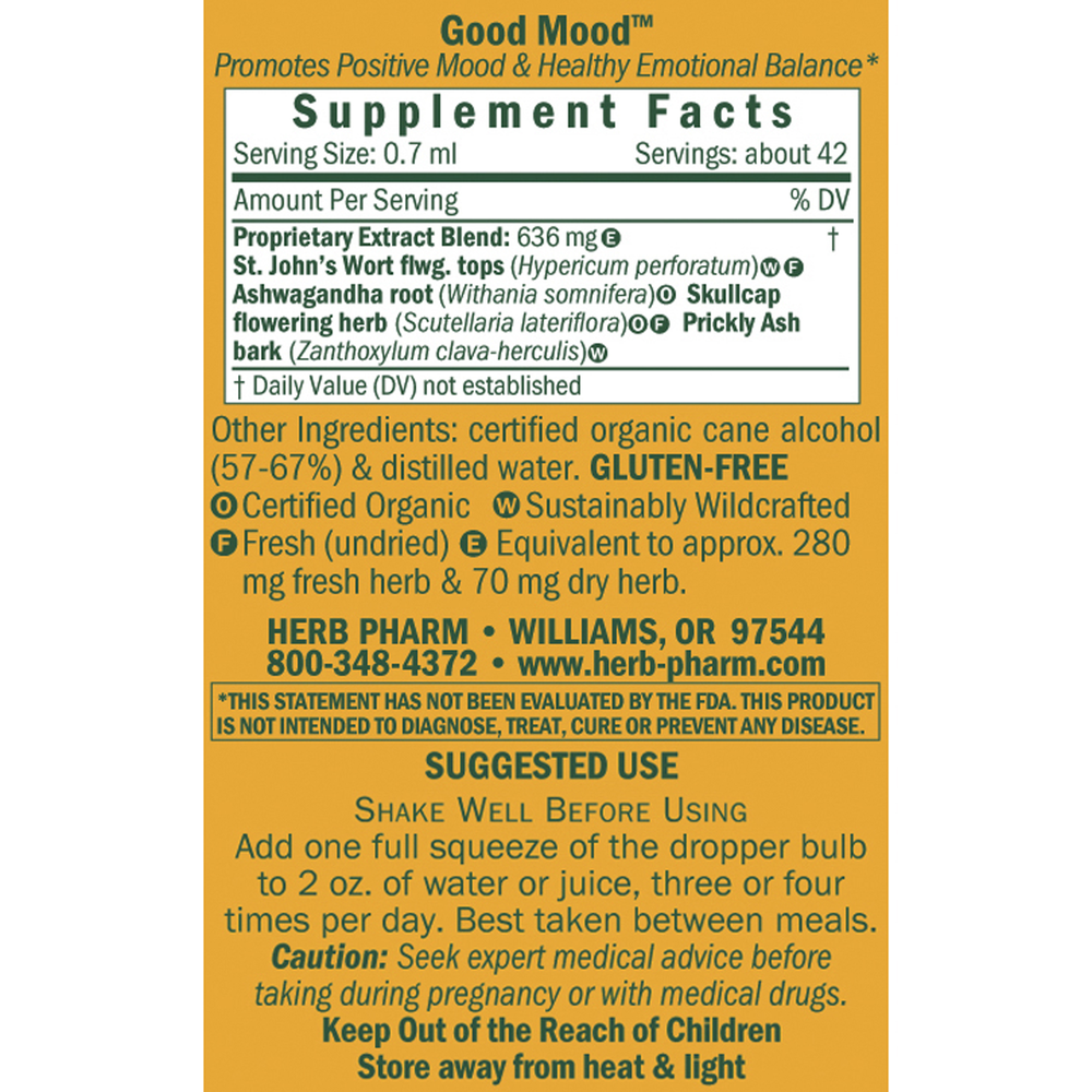 Good Mood features St. John’s Wort (Hypericum perforatum) responsibly wildcrafted in Oregon’s Siskyou and Cascade mountains and extracted fresh each summer near the solstice. It also features Skullcap, prepared from fresh (never dried) Scutellaria lateriflora plants grown on Herb Pharm's Certified Organic farms in southern Oregon.