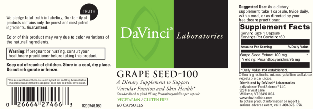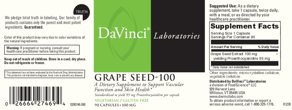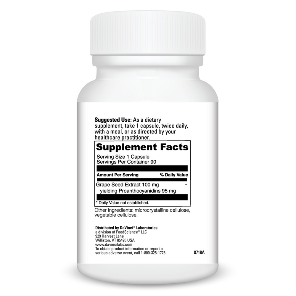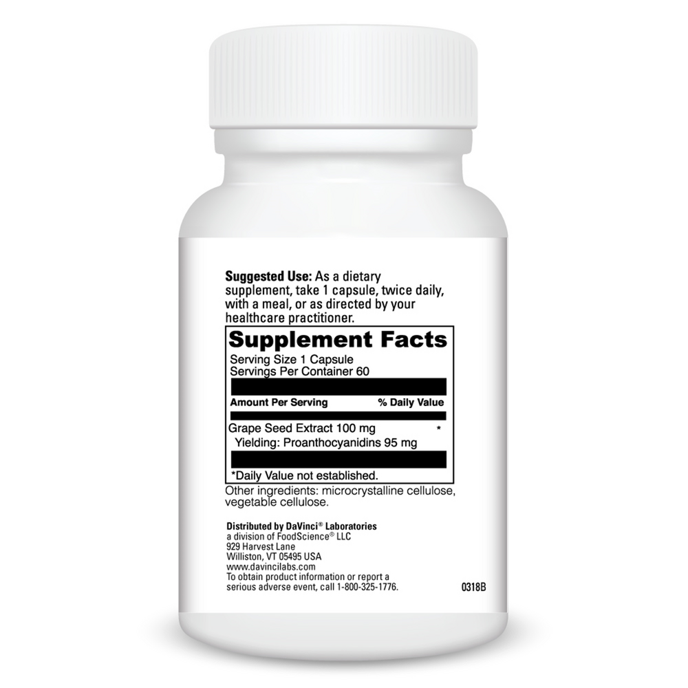 A dietary supplement to support vascular function and skin health.* DaVinci® Laboratories Grape Seed Extract is standardized to yield 95 mg (95%) proanthocyanidins (PCOs) per 100 mg capsule and 47.5 mg (95%) proanthocyanidins per 50 mg capsule. PCOs are a special class of water soluble bioflavonoids that are potent antioxidants.* PCOs also support capillary strength.*