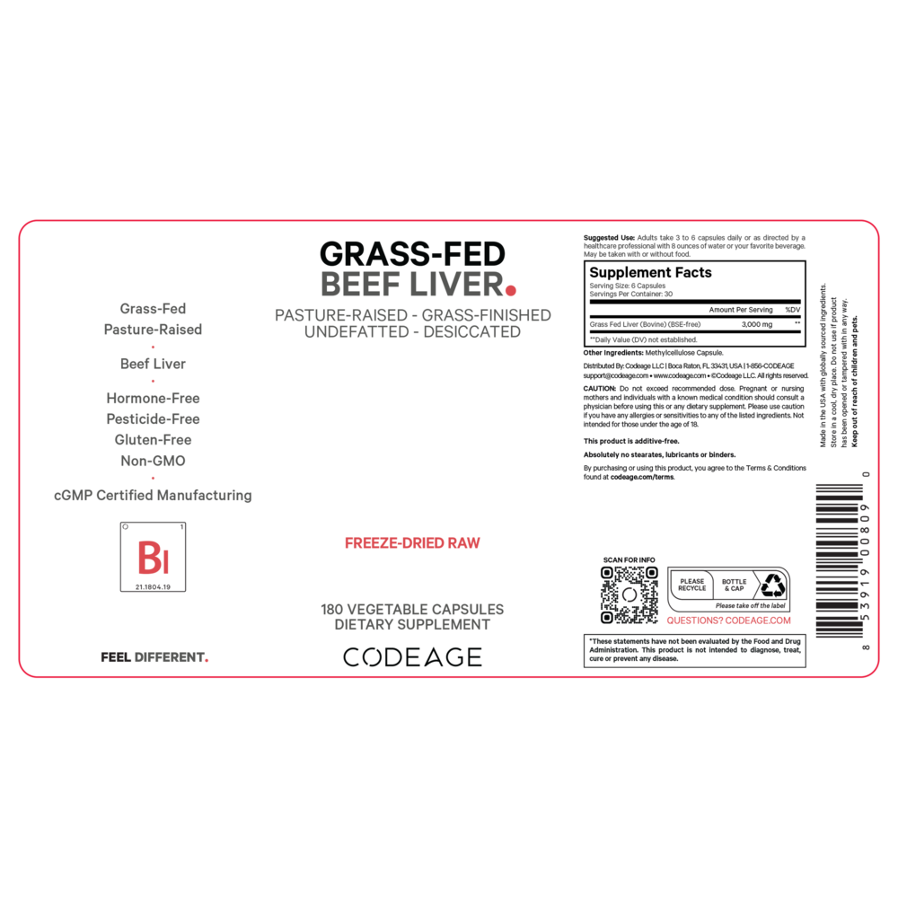 Codeage Grass-fed Beef Liver supplement is freeze-dried, desiccated, and non-defatted. This formula provides 3,000mg of grass-fed pasture-raised bovine liver per serving and can provide a source of different vitamins and nutrients found in the beef liver.