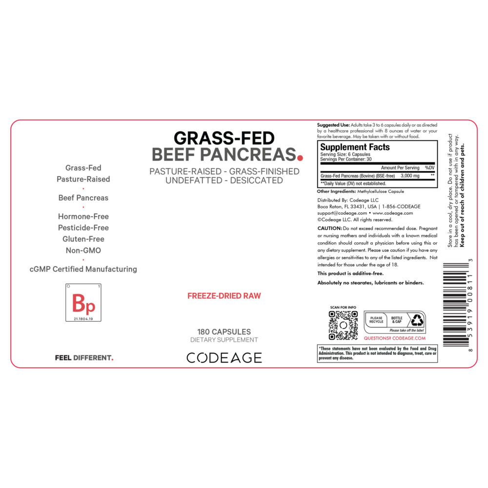 Codeage Grass-fed Beef Pancreas supplements are freeze-dried, desiccated and non-defatted. This formula provides 3,000mg of grass-fed pasture-raised bovine pancreas per serving and can provide a source of different vitamins and nutrients found in the beef pancreas.