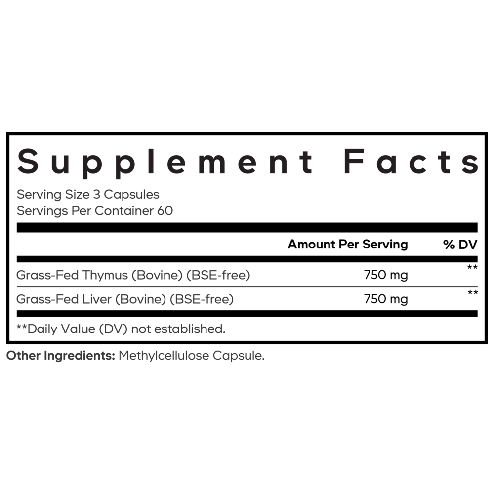 This bovine thymus supplement undergoes a freeze-drying process and is non-defatted and desiccated. It aims to help maintain the nutrients present in the thymus and liver tissues, such as proteins, amino acids, vitamin C, peptides, and other compounds.