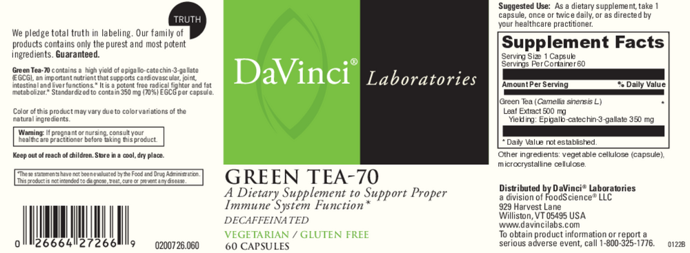 A dietary supplement to support proper immune system function.* EGCG helps to support proper liver, cardiovascular, and immune system functions.* EGCG has been shown to support cholesterol levels within normal ranges.* EGCG is an important nutrient that is also recommended for joint support, intestinal health and healthy weight management.* Green Tea-70 is decaffeinated and contains the highest percentage of EGCG currently on the market.* Green Tea-70 is standardized to contain 70% or 350 mg of EGCG per 500 mg capsule.