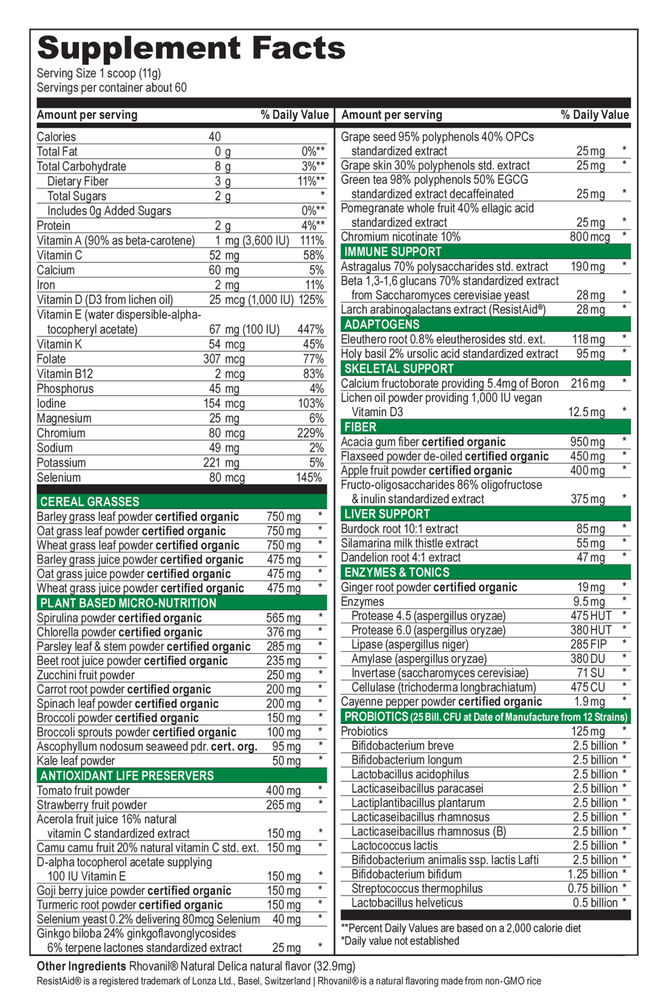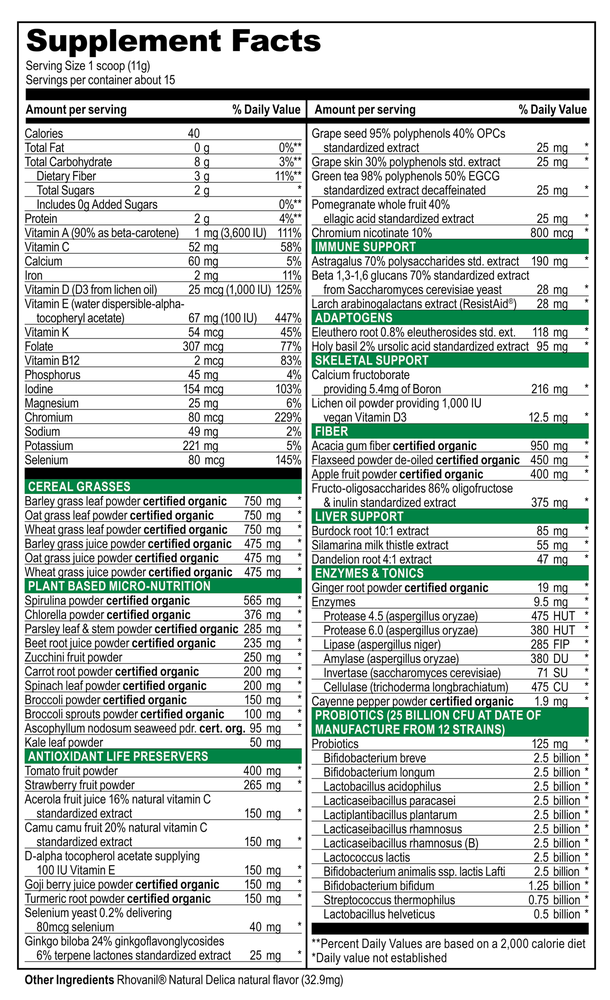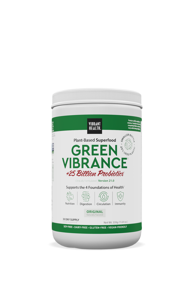 Green Vibrance has lead the way in the green superfoods industry and has won an impressive number of awards since its launch in 1992. It's a comprehensive green superfood that focuses on the four foundations of whole-body wellness: nutrition, circulation, digestion, and immunity.* Green Vibrance is loaded with ingredients that support these areas, including 25 billion probiotics, prebiotics, digestive enzymes, oat grass, goji berries, astragalus, holy basil, flaxseed powder, and so much more.
