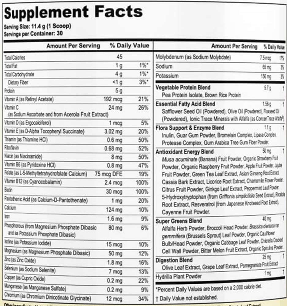 Alfalfa Herb Powder, Broccoli Head Powder, Brassica oleracea var gemmifera (Brussels Sprout) Leaf Powder, Organic Cauliflower Bulb/Head Powder, Organic Cabbage Leaf Powder, Chlorella Cracked Cell Wall Powder, Bitter Melon Fruit Extract, Organic Spirulina Powder