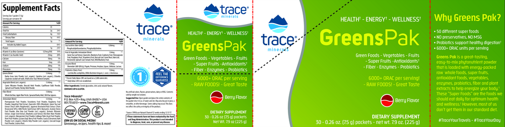 Additionally, Greens Pak is supercharged with over 72 ionic trace minerals and elements from ConcenTrace®, an ionic mineral complex from Utah’s inland sea, the Great Salt Lake.*