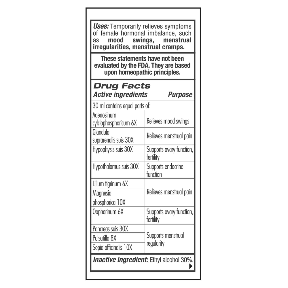 Temporarily relieves symptoms of female hormonal imbalance, such as mood swings, menstrual irregularities, menstrual cramps.