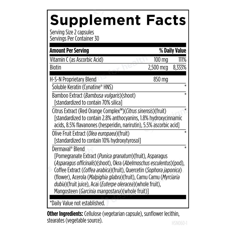 Soluble keratin (Cynatine® HNS) provides a clinically studied bioavailable keratin formulation for moisture, strength, and elasticity for hair, skin, and nails.* Citrus extract (Red Orange Complex®) supports healthy skin appearance, antioxidative status, healthy aging, and a normal inflammatory response.* Dermaval® Blend is a proprietary blend of phytochemical-rich fruits, vegetables, and other botanicals to help promote healthy collagen integrity and overall skin radiance.* H-S-N Radiance™ also contains vitamin C, biotin, and olive fruit extract to help promote collagen production, healthy cell proliferation, and healthy hair, skin, and nail integrity.*