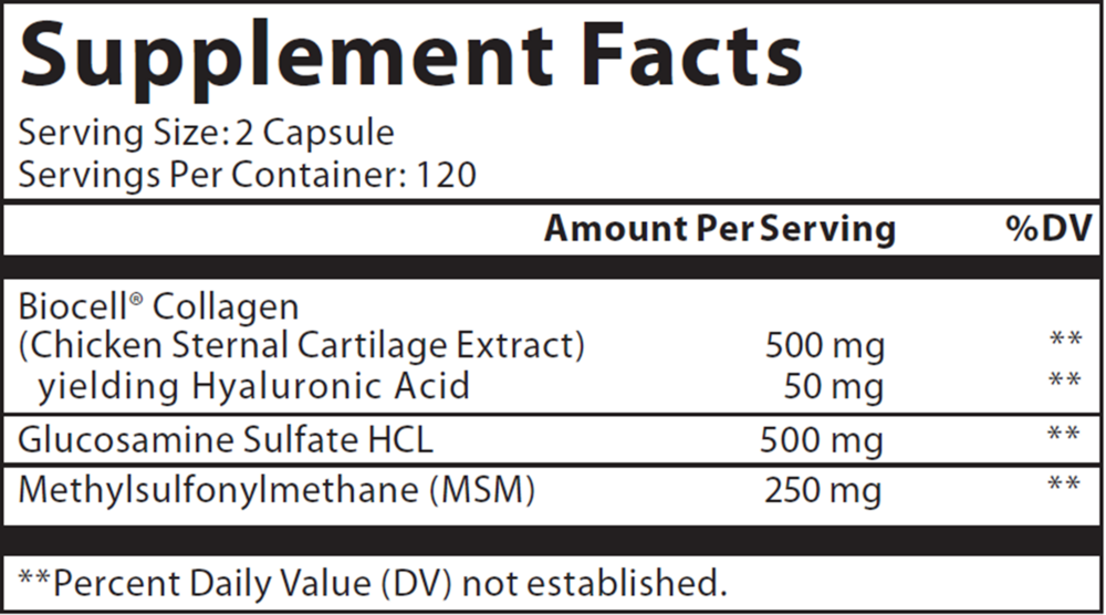 BioCell Type II Collagen Matrix consists of Collagen, Hyaluronic acid in a patented delivery system utilizing a low molecular weight H.A. (less than 30,000 daltons) for optimal utilization by the body and chondroitin sulfate. 60 mg of H.A. per serving.