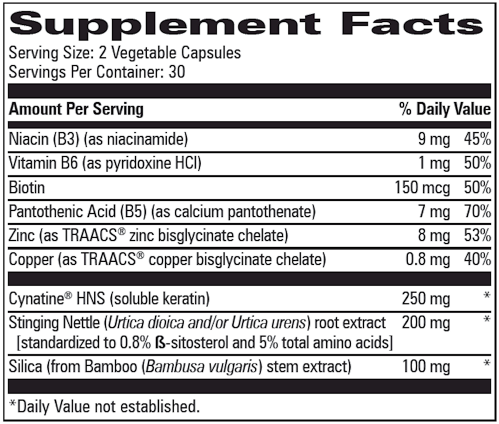 Hair, Skin, and Nail Resilience also provides biotin and essential minerals in their patented TRAACS® forms – which are the only true, scientifically-validated chelated minerals available.*