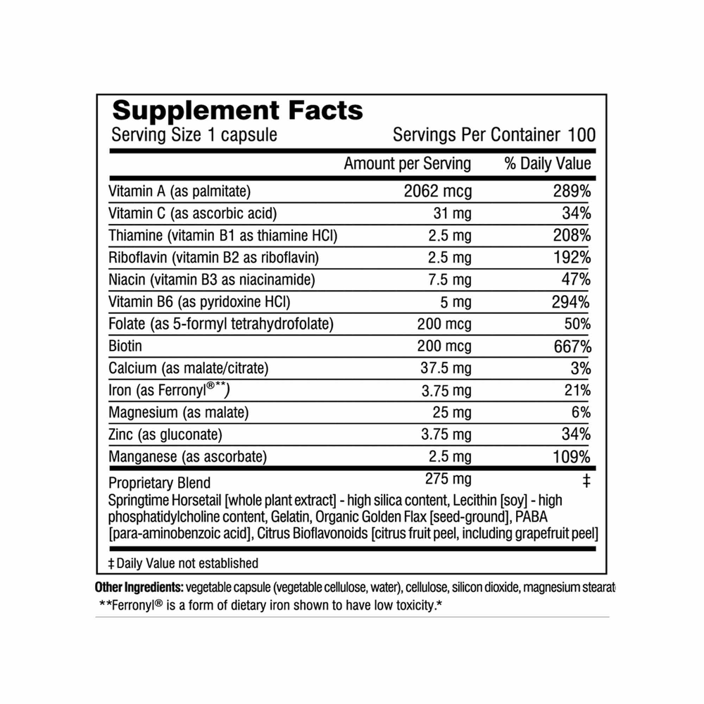 Full range of specific nutrients for building sound tissue structure in hair, skin and nails*.