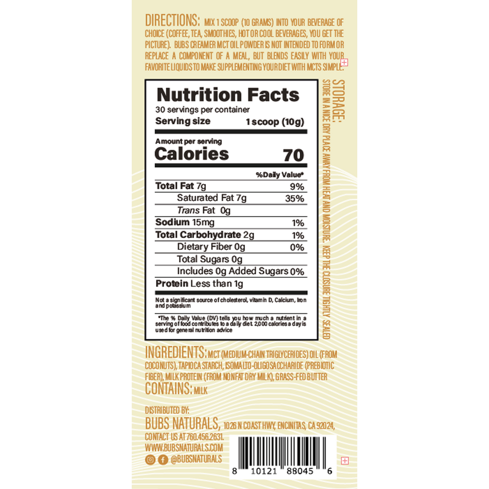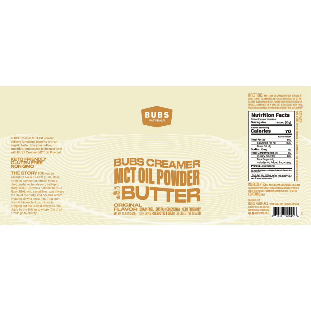 BUBS Halo Creamer provides fast-acting energy and cognitive clarity through its high-quality blend of MCT oil powder, which is rich in caprylic (C8) and capric (C10) acids, along with grass-fed butter. Caprylic acid quickly converts into ketones, allowing it to bypass traditional digestion and fuel the brain directly via the liver. This enhances focus and energy without the typical crash associated with other energy sources. Grass-fed butter contributes butyrate, a short-chain fatty acid that supports gut health and reduces inflammation.