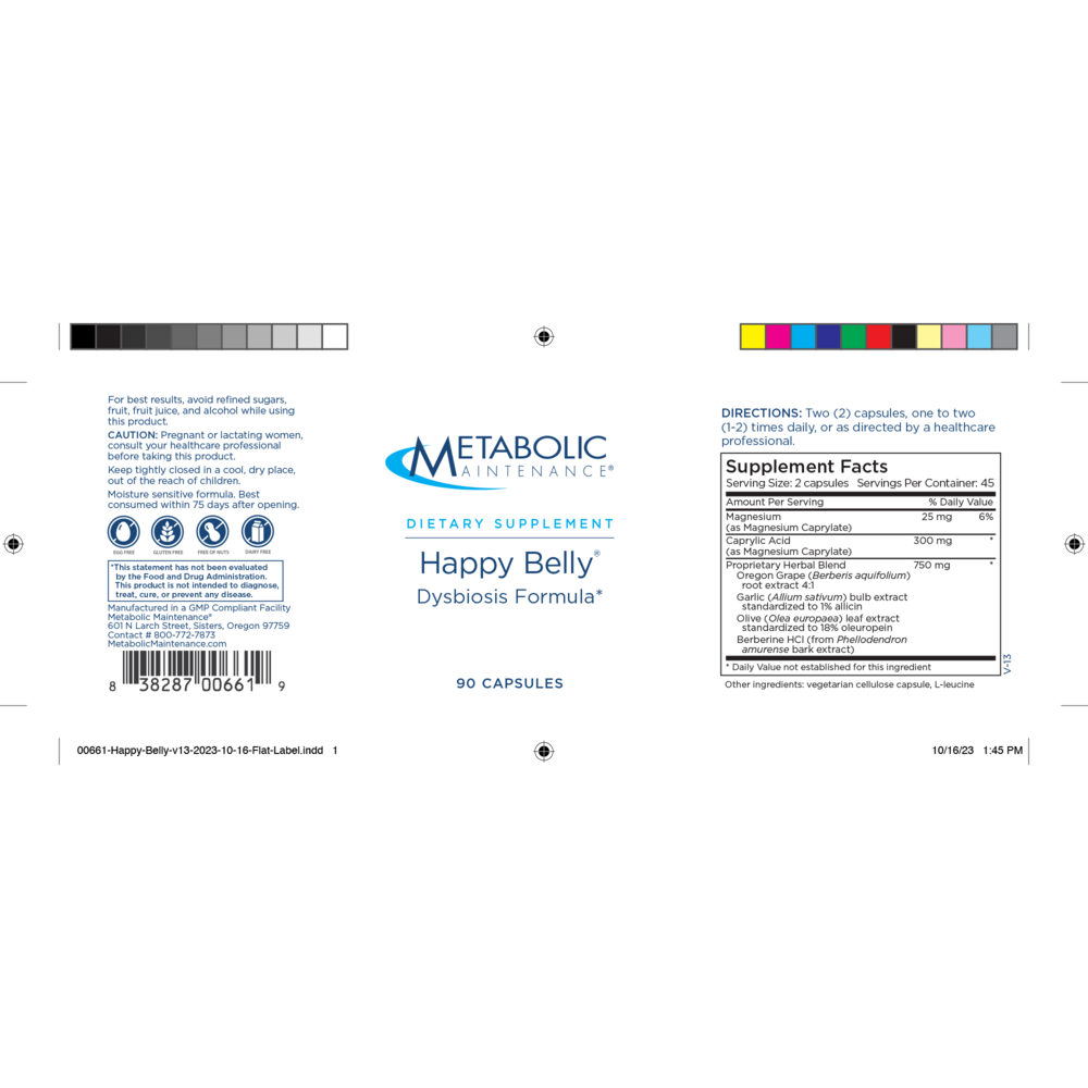 The power of the gastrointestinal (GI) microbiome over human health is becoming increasingly apparent. Over 500 different microorganisms have been identified from the human gut. Beneficial microorganisms produce compounds including digestive enzymes and lactic acid that keep the bowel and body functioning well. Happy Belly® was formulated in collaboration with MetaMetrix Labs after examining over 3,000 stool tests. The ingredients chosen are those found most effective for restoring a normal balance of microorganisms to the GI tract.
