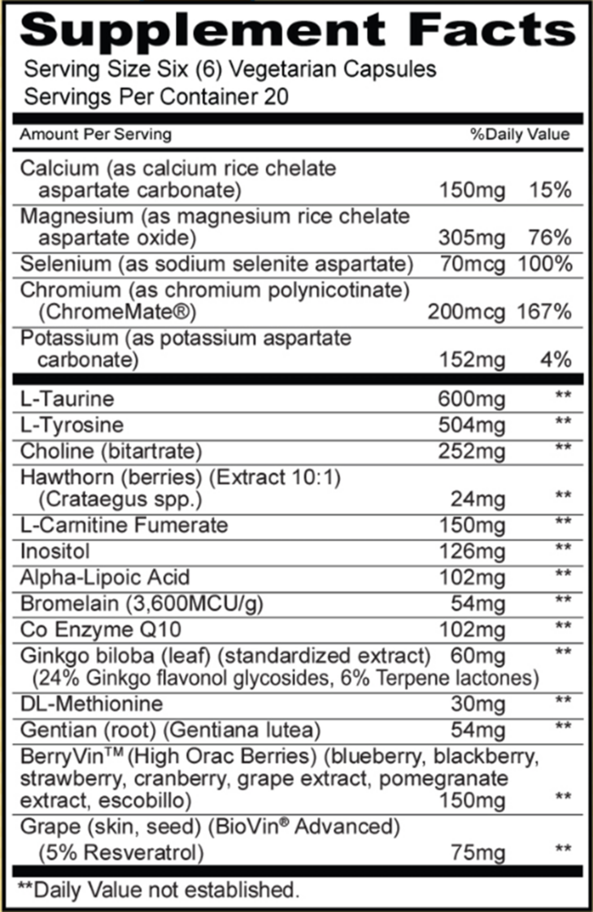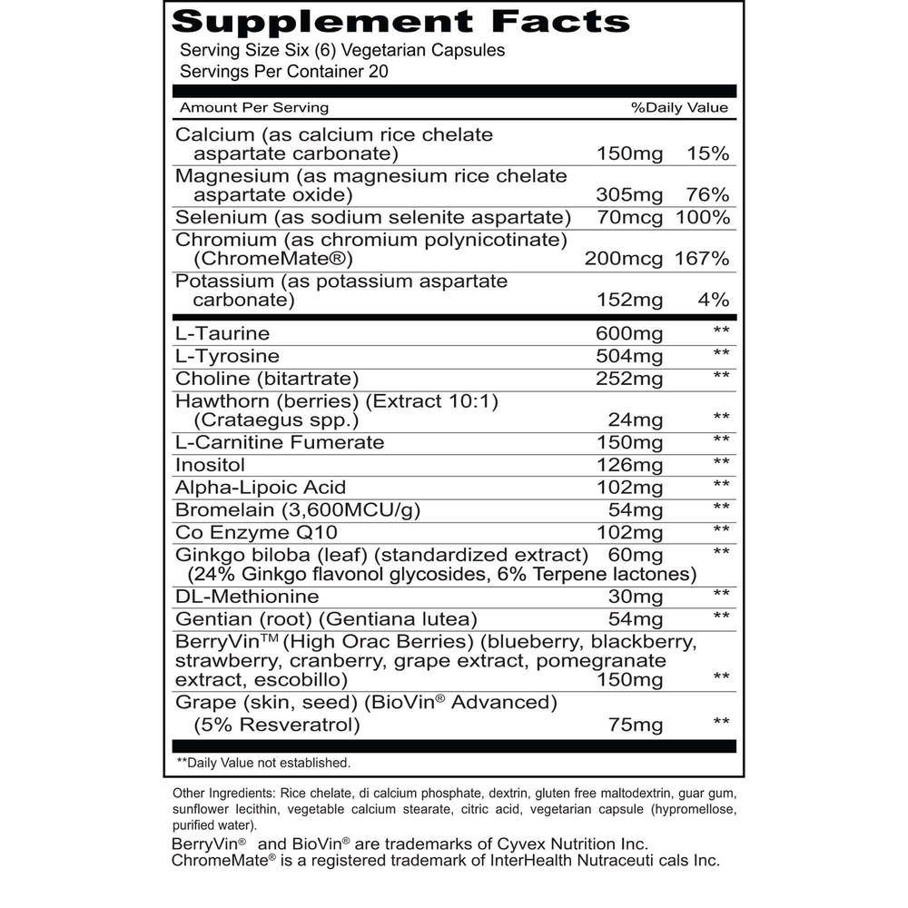 A synergistic blend of balanced nutrients providing support to a healthy cardiovascular system, with the benefits of co-enzyme q10, hawthorne berries, selenium, and chondroitin sulfate.*