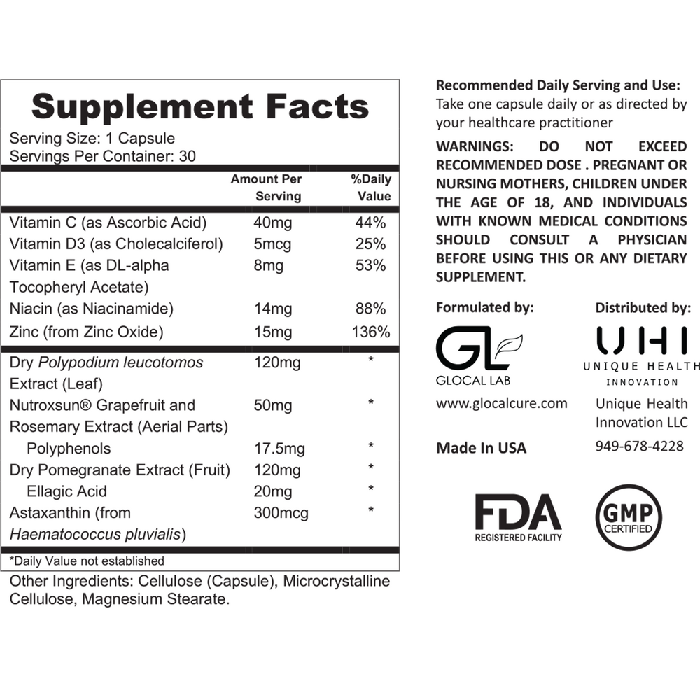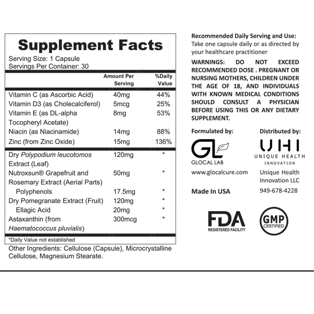 Helio GlocalCare: A holistic sun and light supplement that supports skin and eyes using natural antioxidants.* It helps with erythema and redness and complements any procedure requiring protection against photosensitivity.* (nutroxsun® Polypodium Leucotomos Extract, Astaxanthin, Pomegranate Extract, Vitamin C, Vitamin E, Niacin, Vitamin D3, Zinc)