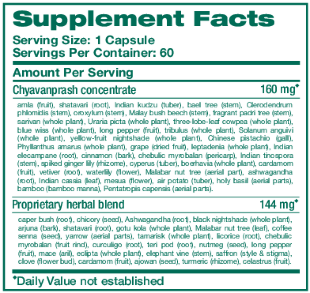 caper bush (root), chicory (seed), Aswagandha (root), black nightshade (whole plant), arjuna (bark), shatavari (root), gotu kola (whole plant), Malabar nut tree (leaf), coffee senna (seed), yarrow (aerial parts), tamarisk (whole plant), licorice (root), chebulic myrobalan (fruit rind), curculigo (root), teri pod (root), nutmeg (seed), long pepper (fruit), mace (aril), eclipta (whole plant), elephant vine (stem), saffron (style & stigma), clove (flower bud), cardamom (fruit), ajowan (seed), turmeric (rhizome), celastrus (fruit)