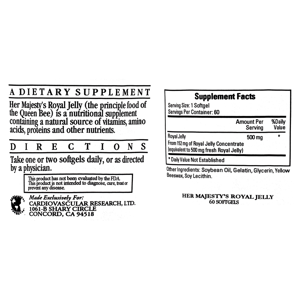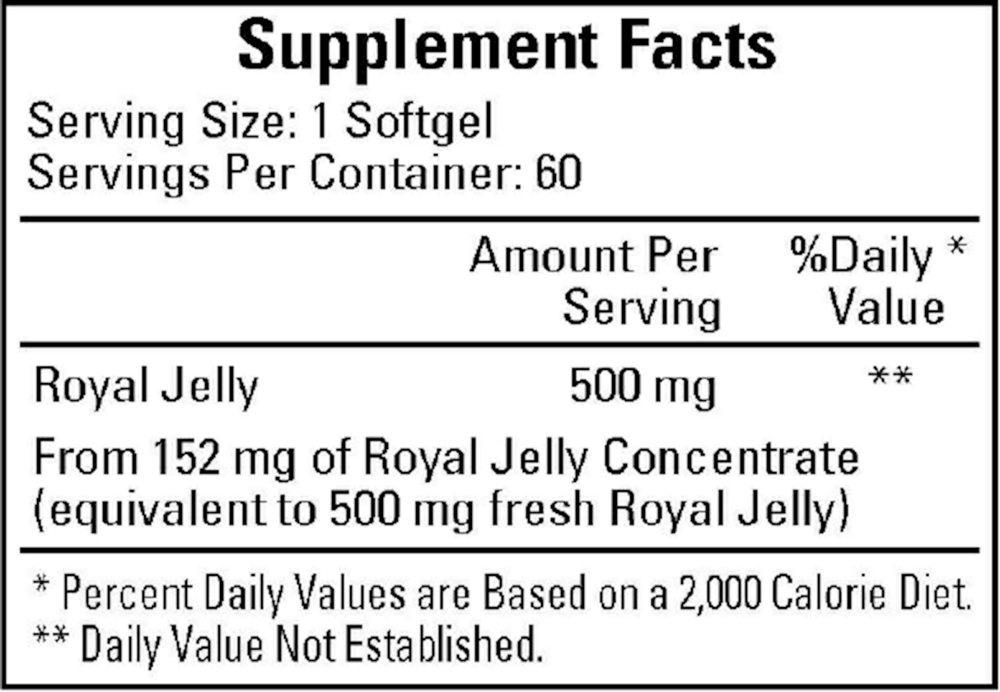 Her Majesty's Royal Jelly 500 mg 60 gels by Ecological Formulas is a dietary supplement designed to support the body's healthy aging and inflammation response properties.* The key ingredient in Her Majesty's Royal Jelly 500 mg 60 gels by Ecological Formulas is royal jelly, a natural section from honey bees that delivers nutrition to larvae and adult queen bees. As the principle food of the queen bees in the beehive, it offers a well-rounded source of vitamins, amino acids, proteins, and other nutrients.