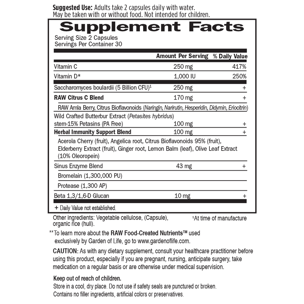 Herbal Immune Balance Sinus is the only product in the Garden of Life line that is specifically designed to provide natural support for sinus health.* The main active ingredient in this herbal formula is Wild Crafted Butterbur which has been validated in multiple human clinical studies. This is combined with a Herbal Immunity Support Blend of 8 wild–crafted herbs along with probiotics, enzymes and whole food vitamins and minerals and beta glucans.