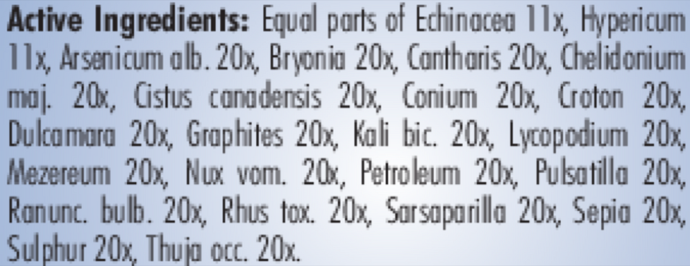 Active Ingredients: Equal parts of Echinacea 11x, Hypericum perforatum 11x, Arsenicum album 15x, Bryonia 15x, Cantharis 15x, Chelidonium majus 15x, Cistus canadensis 15x, Conium maculatum 15x, Croton tiglium 15x, Dulcamara 15x, Graphites 15x, Kali bichromicum 15x, Lycopodium clavatum 15x, Mezereum 15x, Nux vomica 15x, Petroleum 15x, Pulsatilla 15x, Ranunculus bulbosus 15x, Rhus toxicodendron 15x, Sarsaparilla 15x, Sepia 15x, Sulphur 15x, Thuja occidentalis 15x.
