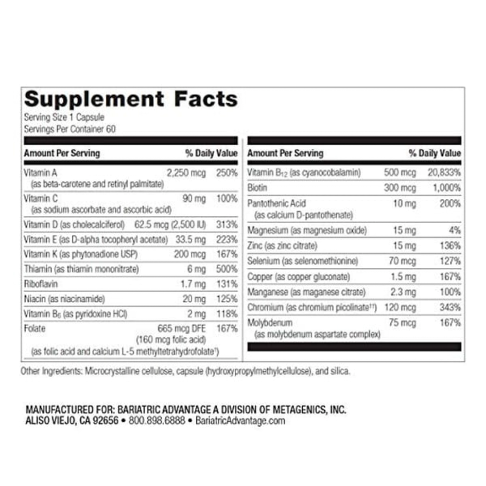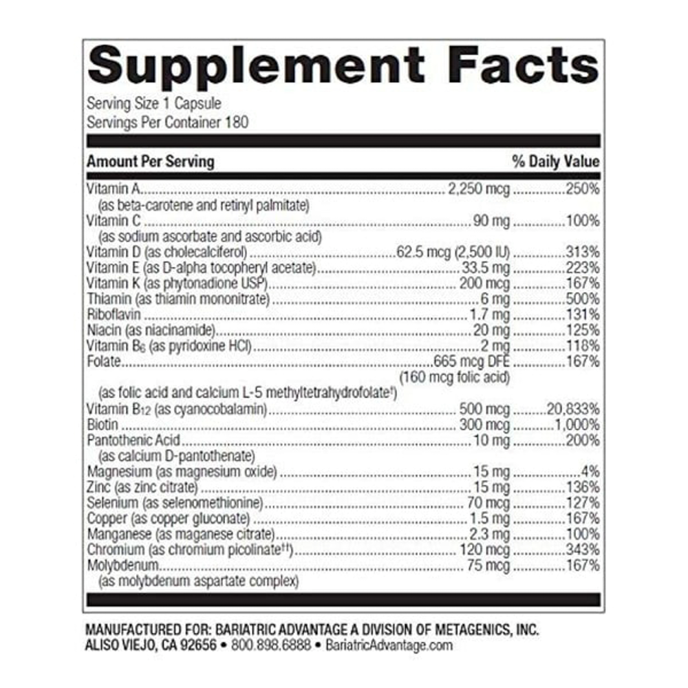 Bariatric Advantage High ADEK Multi is specifically designed to help meet the nutritional needs of patients who have undergone malabsorptive procedures by delivering high levels of vitamins A, D, E, and K in bioavailable nutrient forms.