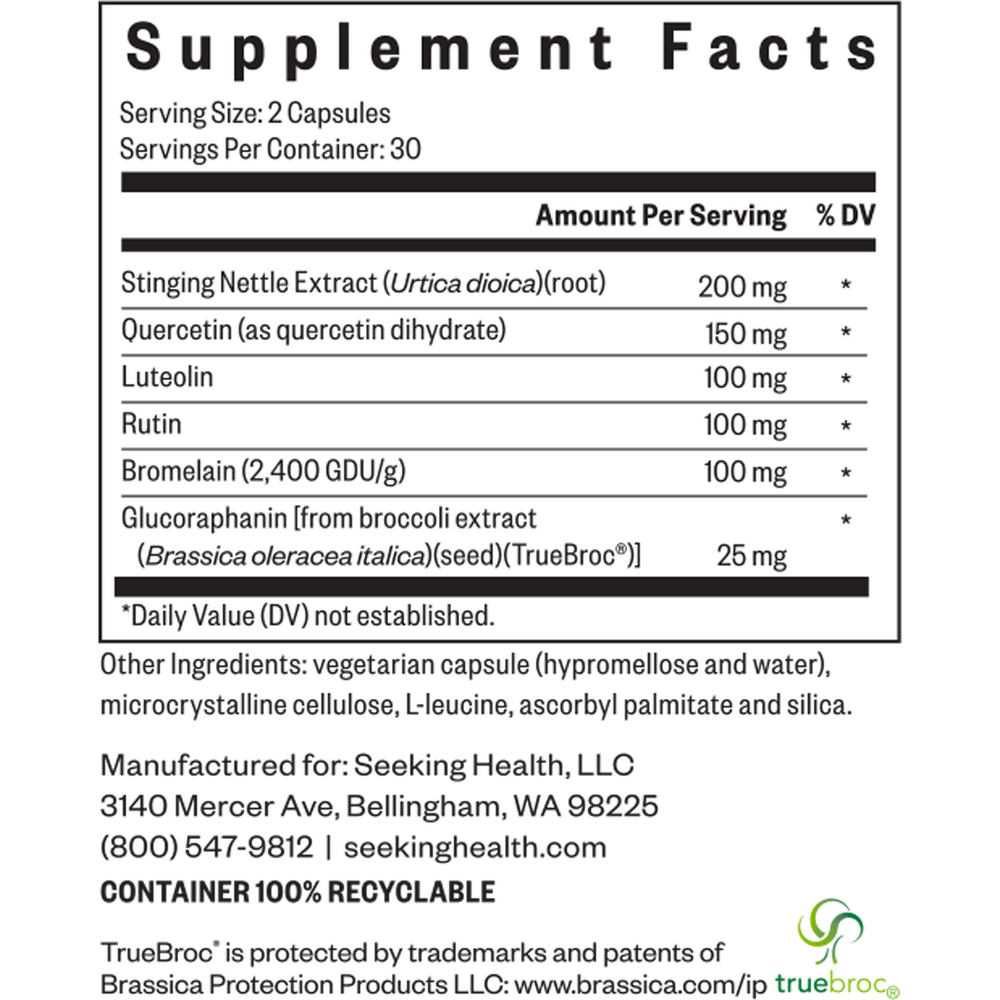 HistaminX by Seeking Health provides a combination of supportive herbal and plant-derived compounds that may work together to support seasonal comfort and a healthy inflammatory response. Dietary changes and environmental factors are thought to contribute to the increase in allergies seen over recent years. Increased consumption of a “Western diet” including fewer fruits and vegetables and more processed grains, fats and meats leads to a significant decrease in dietary intakes of beneficial compounds such as flavonoids, antioxidants, and polyphenols found in fresh fruits and vegetables.*