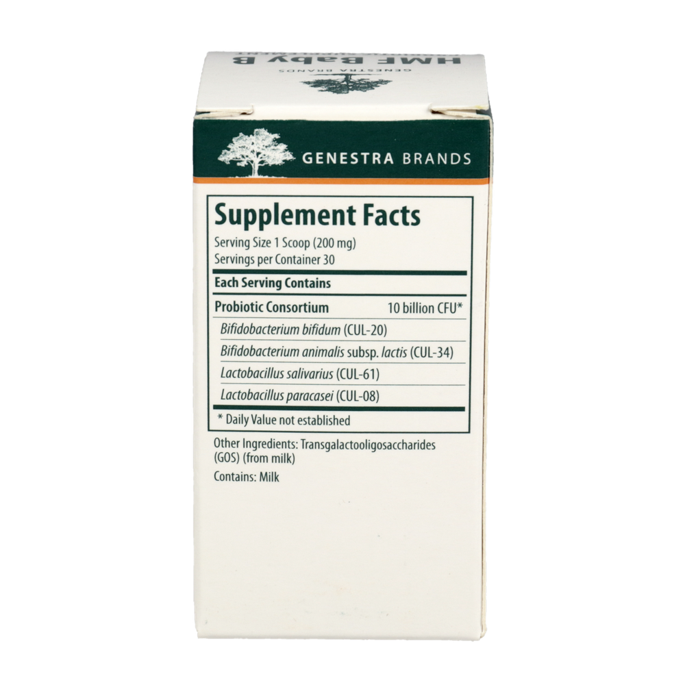 HMF Baby B probiotic formula for breast-fed babies provides Lactobacillus salivarius, Lactobacillus paracasei, Bifidobacterium bifidum and Bifidobacterium animalis subsp. lactis, which help to promote immune function and skin health in children. HMF Baby B powder dissolves easily into milk or water, and is free of gluten and soy. Ideal for vegetarian children.*