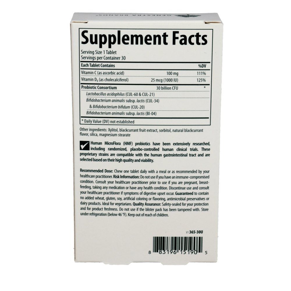 HMF Immune combines proprietary probiotics with vitamins C and D to provide targeted support for the immune system. Each convenient, once-daily chewable tablet provides a blend of five research-driven probiotic strains from both the Lactobacillus and Bifidobacterium genera. As nearly 80% of the body’s immunologically active cells are located in gut-associated lymphoid tissue, an important connection has been demonstrated between the intestines and the immune system. In addition to supporting gastrointestinal health, HMF Immune provides Bl-04, a strain that has been shown in a clinical trial to support upper respiratory tract health in physically active adults. Similarly, it offers CUL-60, CUL-21, CUL-34 and CUL-20, which were demonstrated in a clinical trial to support upper respiratory tract health in children when combined with vitamin C. To further help maintain immune function, HMF Immune contains vitamins C and D. Vitamin C supports the immune system by regulating lymphocyte proliferation, natural killer cell activity and immunoglobulin production, while vitamin D helps control T cell activation, cytokine release and phagocytosis in macrophages. Research demonstrates that vitamins C and D may be especially effective in maintaining immune function in the respiratory tract.*