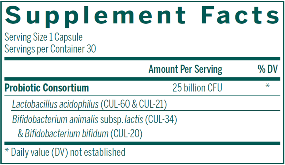 • Provides 25 billion CFU per day of two strains of Lactobacillus acidophilus, Bifidobacterium bifidum, and Bifidobacterium animalis subsp. lactis
