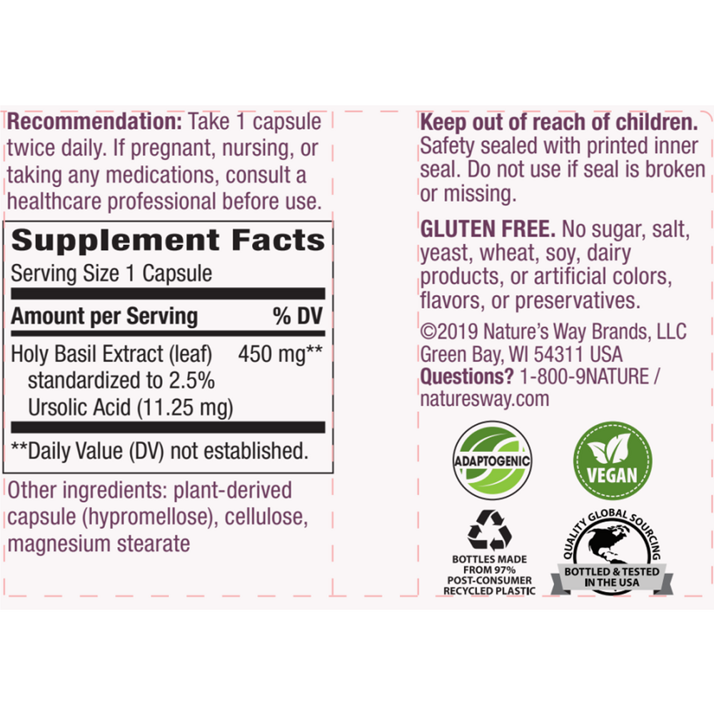 Holy Basil is an adaptogen that is native to India and is considered sacred in the Hindu culture. Known as the "queen of the herbs", Holy Basil is used for stress support.* Nature's Way® sources Holy Basil from India, where it grows best.