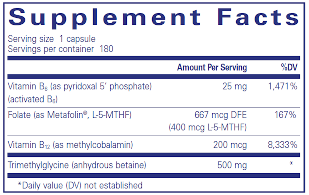 Betaine, in the form of trimethylglycine, is included in this supplement to promote the absorption of these important nutrients. Homocysteine Factors provides vitamin B6, vitamin B12, folate and betaine, a highly bioavailable combination of nutrients integral to supporting healthy homocysteine levels and cardiovascular health.*