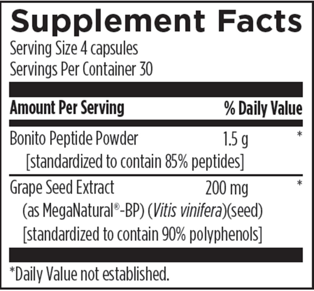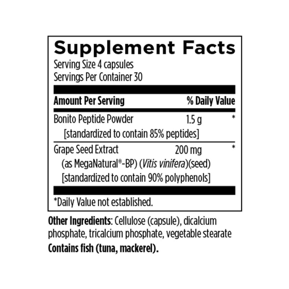 HTN Supreme™ has been formulated to support healthy blood pressure and promote overall cardiovascular health.* Each 4-capsule serving provides 1.5 grams of bonito peptide powder (standardized to contain 85% peptides) and 200 mg of grape seed extract (standardized to contain 90% polyphenols). There are numerous pharmaceutical drugs that address healthy blood pressure, but some of them may induce undesirable side-effects. Combined with dietary and lifestyle modification, HTN Supreme™ may have a beneficial impact on maintaining a healthy blood pressure and positively affecting cardiovascular health.*