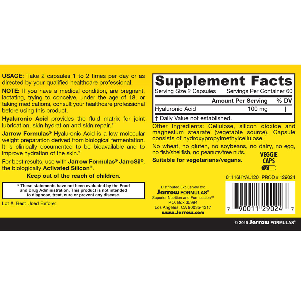 Jarrow Formulas® Hyaluronic Acid is derived from biological fermentation. It is bioavailable and supports skin health.* Hyaluronic Acid is present in the body as a natural component of joint cartilage, synovial joint fluid and skin connective tissue.*