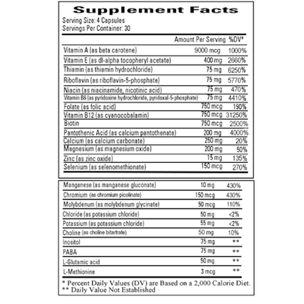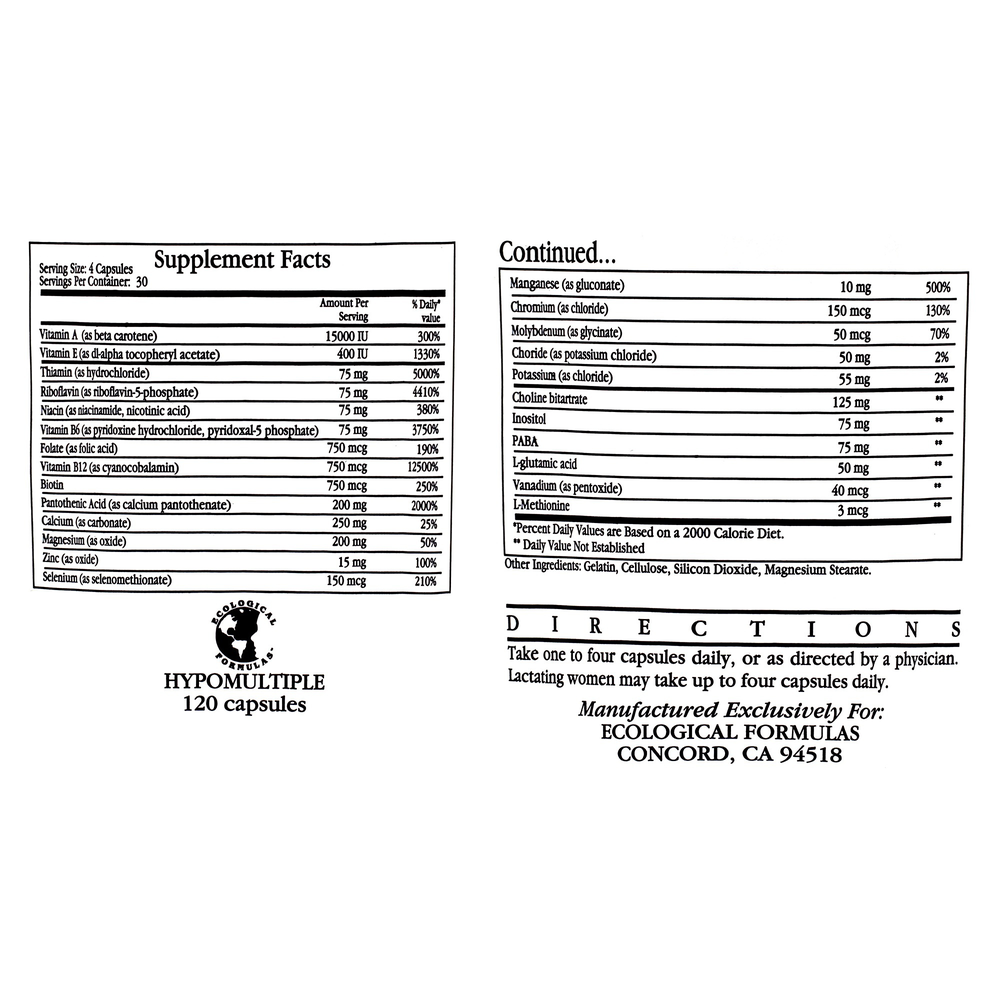Hypomultiple without Cu/Fe by Ecological Formulas is a dietary supplement designed to provide nutritional support for maintaining overall good health.* Hypomultiple without Cu/Fe by Ecological Formulas is a high quality multiple vitamin supplement for individuals who don't want an additional supply of copper or iron. This formula features more than two dozen potent vitamins and minerals including vitamin A, vitamin E, B-complex vitamins, chromium, magnesium, potassium, zinc, selenium and molybdenum. Since most individuals don't get their necessary daily requirements of nutrients from dietary choices alone, this supplement helps to guard against any nutritional deficiency.