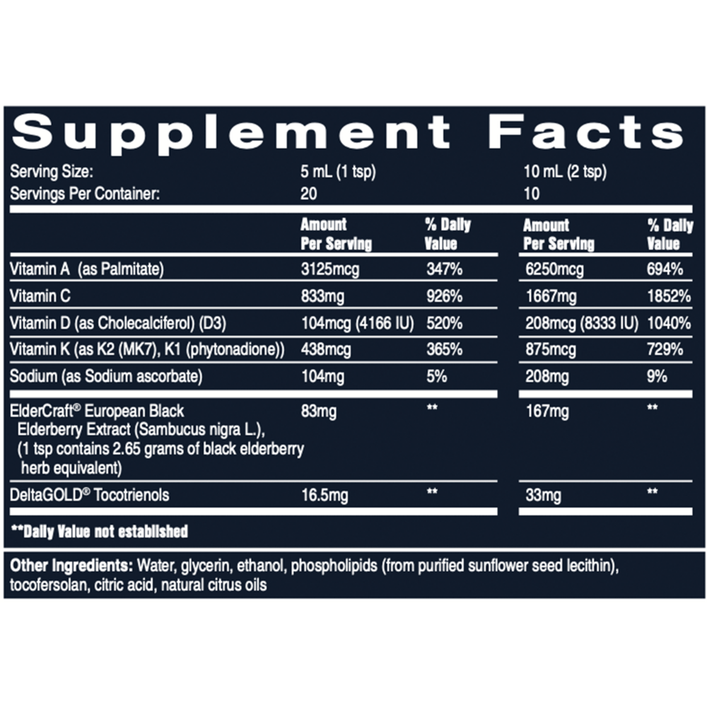 Immune Charge+™ is a comprehensive, high-dose blend of vitamins C, A, D, E, K1, K2 and elderberry (Sambucus nigra) delivered in a single serving shot, designed to rapidly support immune function.*
