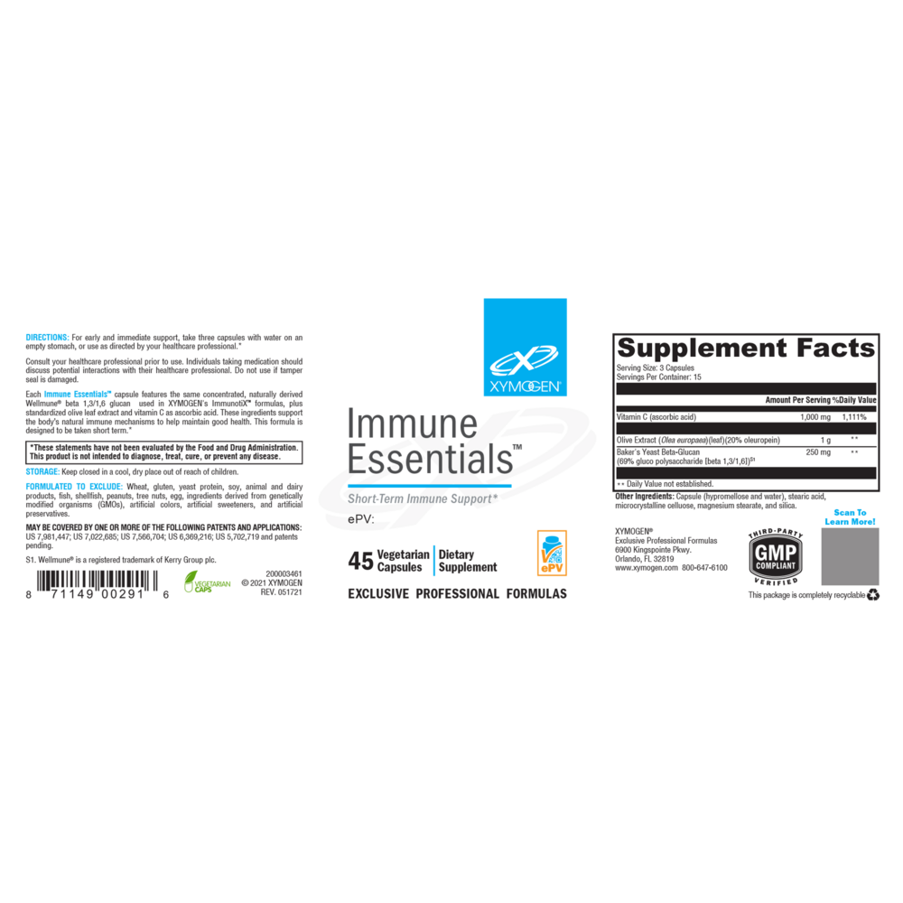 Each Immune Essentials™ capsule features the same concentrated, naturally derived Wellmune® beta 1,3/1,6 glucan used in XYMOGEN's ImmunotiX™ formulas, plus standardized olive leaf extract and vitamin C as ascorbic acid. These ingredients support the body’s natural immune mechanisms to help maintain good health. This formula is designed to be taken short term.*