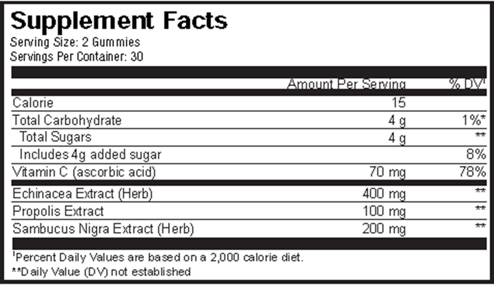 Codeage Immunity Gummies are raspberry flavored vegan gummies combining 70 mg of Vitamin C with an immune blend of echinacea, propolis, and elderberry herbal extracts in a soft and convenient form. This gummy supplement is pectin-based with no animal gelatin