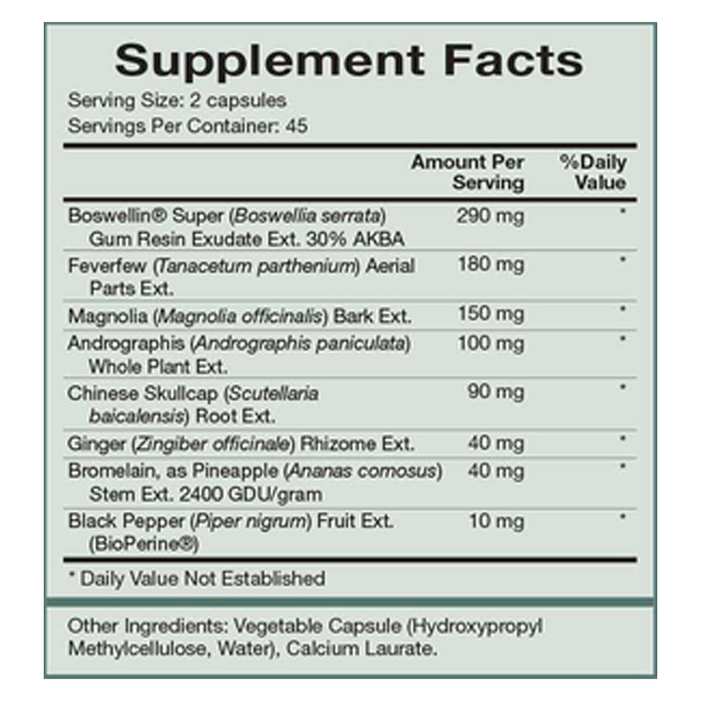 InflamAway™ supports healthy activity of the inflammatory response function by encouraging normal and natural processes of cytokines and prostaglandins. It features Boswellin Super®, a select extract of Frankincense (Boswellia serrata) which is standardized to 30% AKBA and 50% B-boswellic acid. AKBA is a natural compound that reduces LOX-5 and COX-2, as well as other activators. Additionally, InflamAway™ works at the cellular level to modulate important pathways to protect the body from the buildup of cellular by-products generated by the inflammatory response function.*