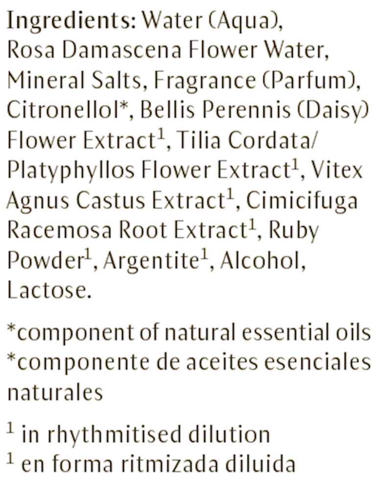 Formulation: Rose distillate works with rhythmitised dilutions of daisy, black cohosh and gemstones argentite and ruby powder to help revitalize dull, lifeless skin and help reduce the appearance of redness and irregular pigmentation.