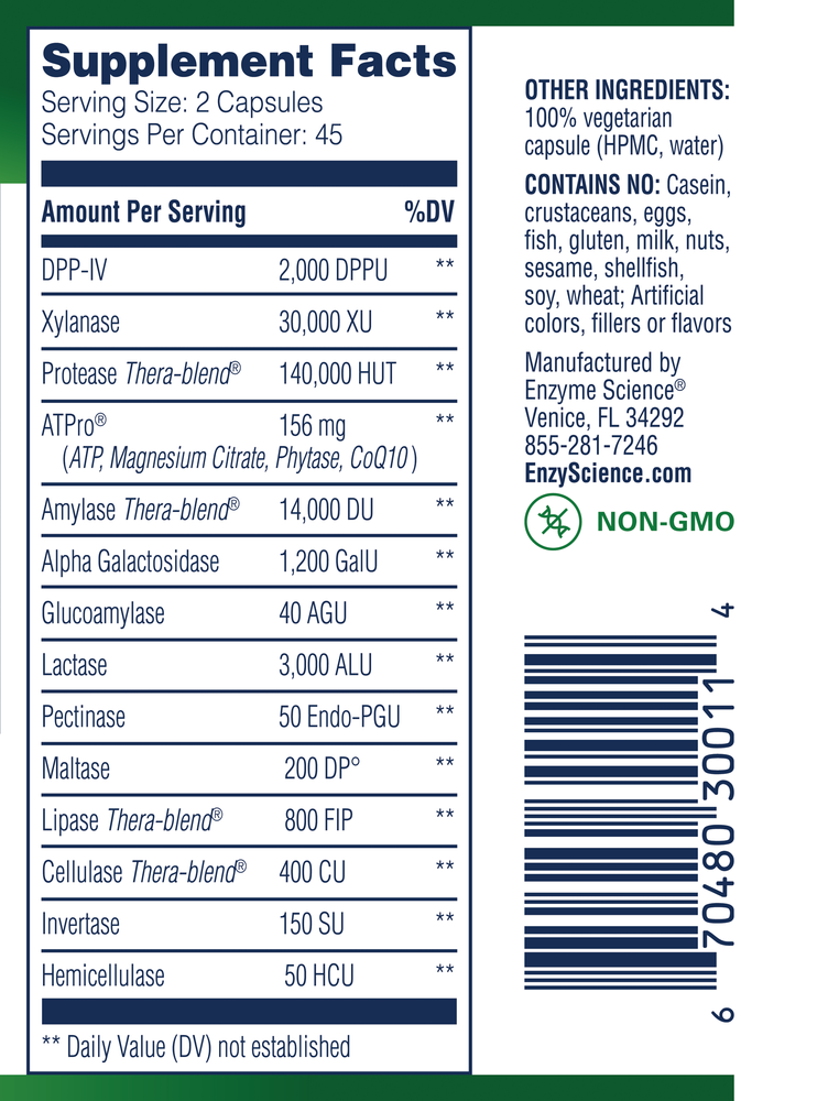 Enzyme Science formulates each enzyme focused product with exclusive Thera-blend enzymes. The Thera-blend process is scientifically designed to provide optimal solutions for digestive health and wellness. These unique protease, amylase, cellulase and lipase enzymes are comprised of multiple variants which are blended to work synergistically throughout the broad pH range of the human body.