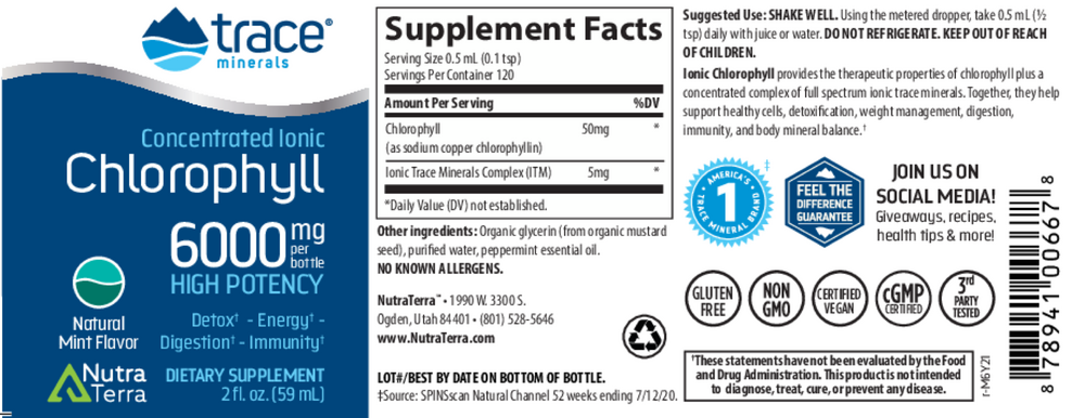 Concentrated Ionic Chlorophyll high potency 6000 mg per serving provides the therapeutic properties of chlorophyll plus a concentrated complex of full spectrum ionic trace minerals. Together, they help support healthy cells, detoxication, weight management, digestion, immunity, and body mineral balance.† Chlorophyll can help you detoxify your body- Chlorophyll has shown in studies to be an effective antioxidant. These studies found a noticeable difference of 55% in free radical activity as compared to a placebo.* Trace Minerals guarantees that you will love this product- Trace Minerals is so confident that you will love this product, that we are willing to guarantee it.
