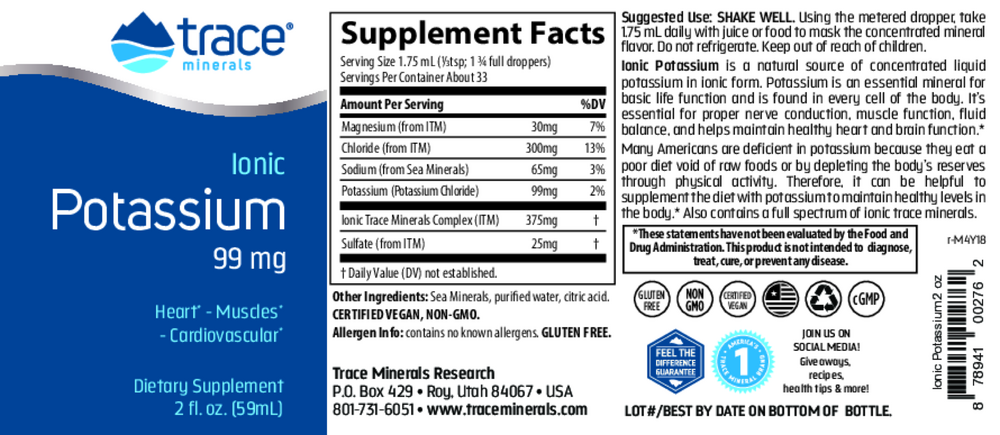Ionic Potassium is a natural source of concentrated liquid potassium in ionic form. Potassium is an essential mineral for basic life function and is found in every cell of the body. It’s essential for proper nerve conduction, muscle function, fluid balance, and helps maintain healthy heart and brain function.*