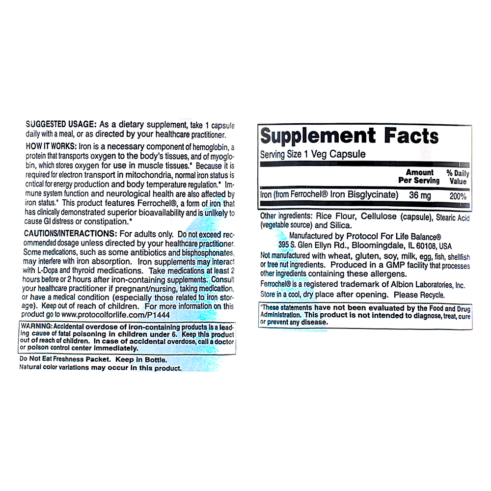 Iron is a necessary component of hemoglobin, a protein that transports oxygen to the bodys tissues, and of myoglobin, which stores oxygen for use in muscle tissues.* Because it is required for electron transport in mitochondria, normal iron status is critical for energy production and body temperature regulation.* Immune system function and neurological health are also affected by iron status.* This product features Ferrochel®, a form of iron that has clinically demonstrated superior bioavailability and is unlikely to cause GI distress or constipation.*