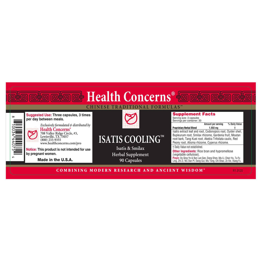 Ingredient Quantity Proprietary Herbal Blend 1950 mg Isatis extract leaf and root - Codonopsis root - Oyster Shell - Bupleurum Root - Smilax rhizome - Gardenia Fruit - Moutan root bark - Tang Kuei root - Akebia Trifoliata caulis - Red Peony root - Alisma Rhizome - Cyperus rhizome - Other Ingredients: Rice bran and hypromellose (vegetable cellulose).Serving size: 3 Capsule