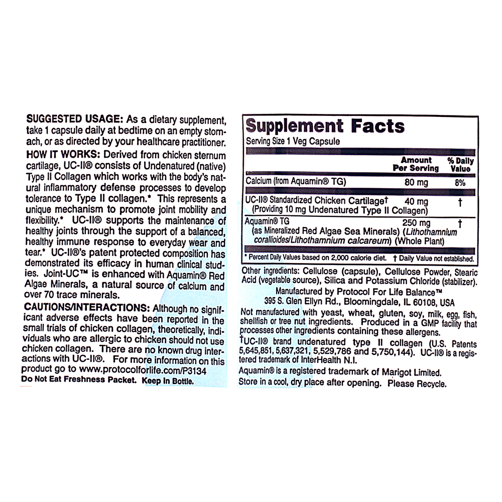 UC-II® is an undenatured (native) Type II Collagen that is derived from chicken sternum. Due to its unique configuration, it is capable of interacting with the normal immune system when administered orally.* UC-II® has been clinically validated for its ability to help maintain healthy joints through the support of a balanced immune system response to everyday wear and tear.* Joint-UC™ is enhanced with Aquamin® Seaweed Derived Minerals, a natural form of calcium and over 70 trace minerals.