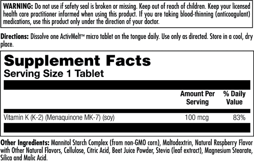 KAL® K-2 MK-7 ActivMelt™ micro tablets melt quickly in the mouth and are designed for optimal absorption in the body. Each micro tablet provides Vitamin K-2 in the MK-7 from. Studies suggest MK-7 last longer in the body then other forms of vitamin K. Vegan, Gluten Free, Lactose Free