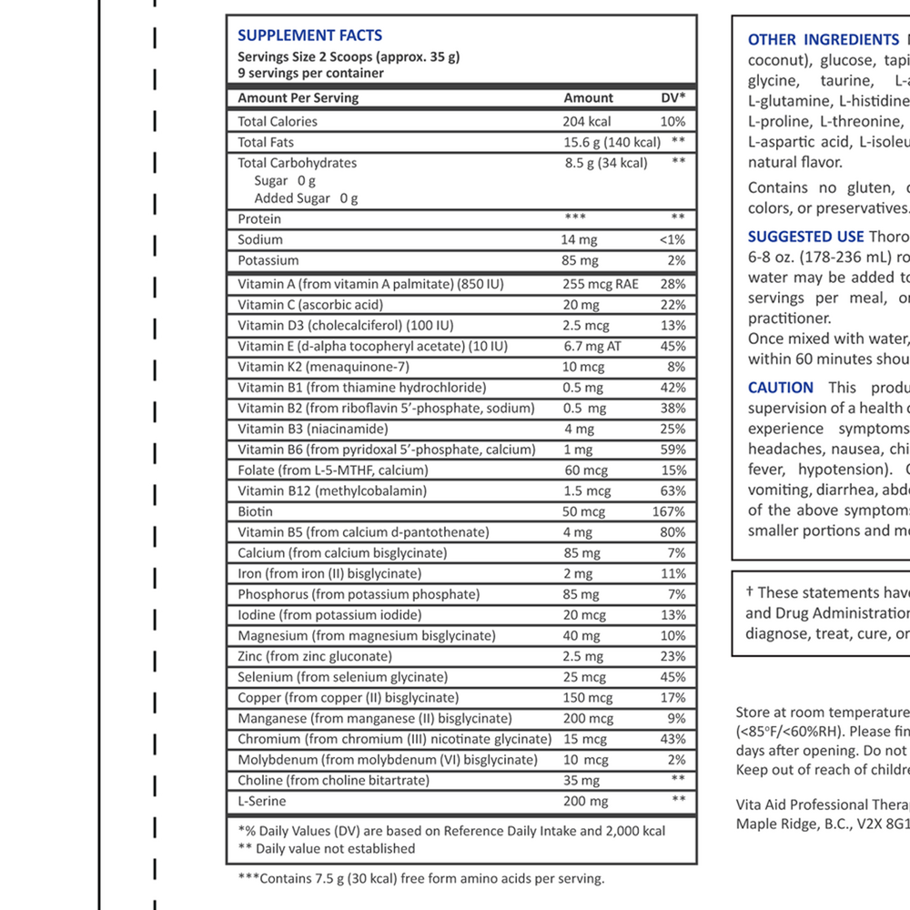 Other Ingredients: Medium chain triglycerides (from coconut), tapioca maltodextrin, glycine, taurine, L-alanine, L-arginine, L-cysteine, L-glutamine, L-histidine, L-leucine, L-lysine, L-methionine, L-proline, L-threonine, L-tryptophan, L-tyrosine, L-valine, L-aspartic acid, L-isoleucine, L-phenylalanine, L-carnitine, rebaudioside M, natural flavor, sodium chloride