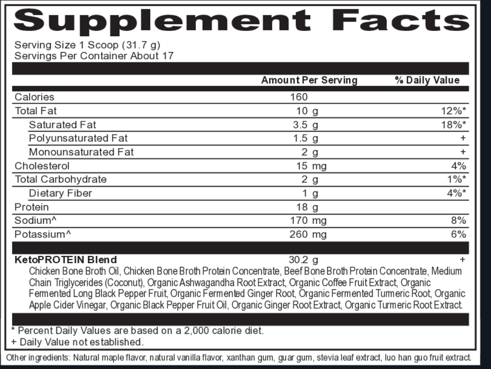 Keto Protein is an ideal protein solution for the ketogenic dieter, weekend warrior, busy executive, student, gamer or anyone looking to boost mind and muscle power.* Providing high-quality protein and fat from chicken bone broth and coconut MCTs plus energizing antioxidant and adaptogenic herbs—Keto Protein is designed to take your performance to the next level.*