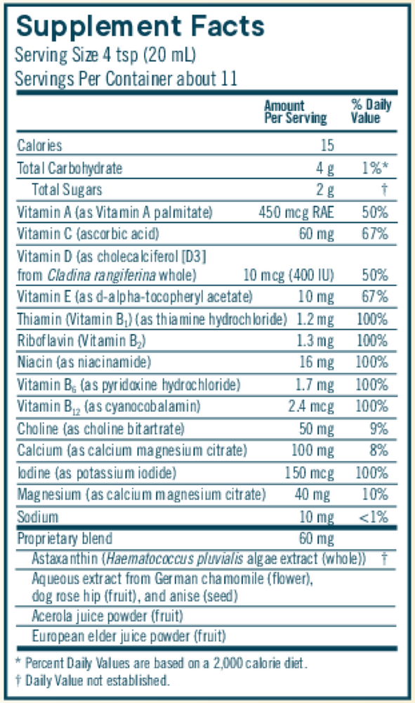 Adults and children 4 years and over: Shake bottle gently before use. Take 20 mL (4 tsp) daily with food, a few hours before or after taking other medications or supplements. Keep out of reach of children. Store unopened bottle at room temperature.