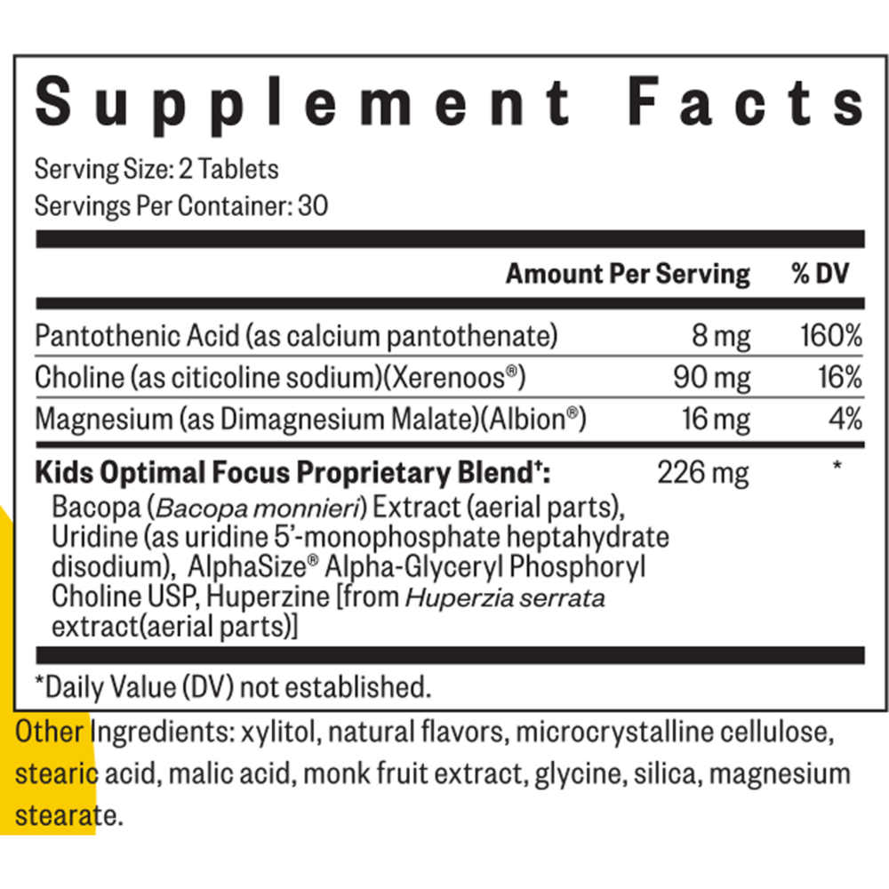 Kids Optimal Focus supports healthy acetylcholine levels via a kid-approved, great-tasting chewable to help kids succeed at school, at home, and in social situations.*