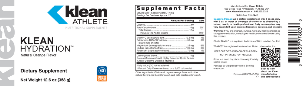 An athlete’s most important asset on game day, during training, or out on the race course is his/her engine. To perform at its best, the body requires adequate fluid and electrolyte intake before, during and after exercise. During physical activity, the body loses fluid and electrolytes through sweat. Even modest fluid losses can diminish physical performance. Klean Hydration™ consists of 6% carbohydrates, comprised of simple carbohydrates (glucose and fructose) and a complex carbohydrate (branched dextrin) with additional minerals for the replacement of fluid and electrolytes during physical activity.† The carbohydrates and sodium in this natural orange-flavored drink mix support the intestinal absorption of fluids to maximize hydration efficiency.† Klean Hydration™ also has an osmotic concentration, or osmolarity, similar to that of body fluids, to support fluid replenishment without slowing you down.† Performing at your best through optimal hydration is simple with this great-tasting, naturally sweetened and balanced hydration powder.†